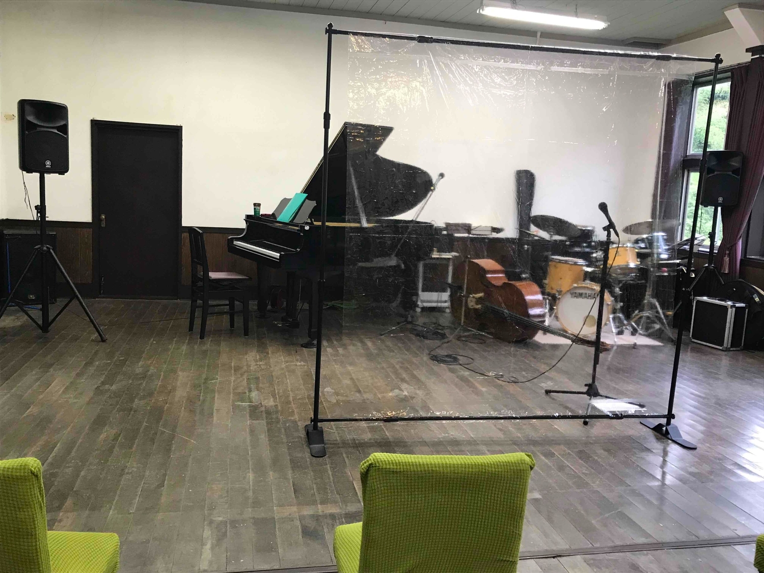 多くのライブハウスで取り入れられているのが感染予防のビニールシートやアクリル板、ライブをするお店には設置されていますが、そのような仕様になっていない会場で演奏する場合、お客様との距離を十分とるか、自前で感染予防シートを用意するかです。