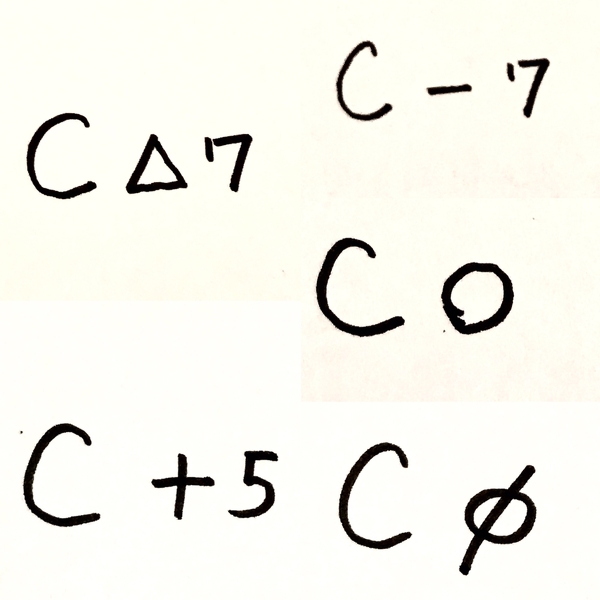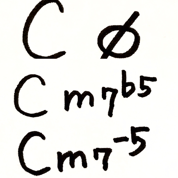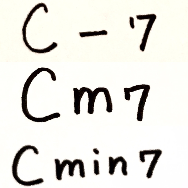 ②♭5とか♭7とかく場合、一瞬だとルート音に♭がついていると誤解されやすいので括弧をつけて(♭5)と書いたり、それこそマイナスを使って「ー5」と書くとわかりやすいのでオススメです。
