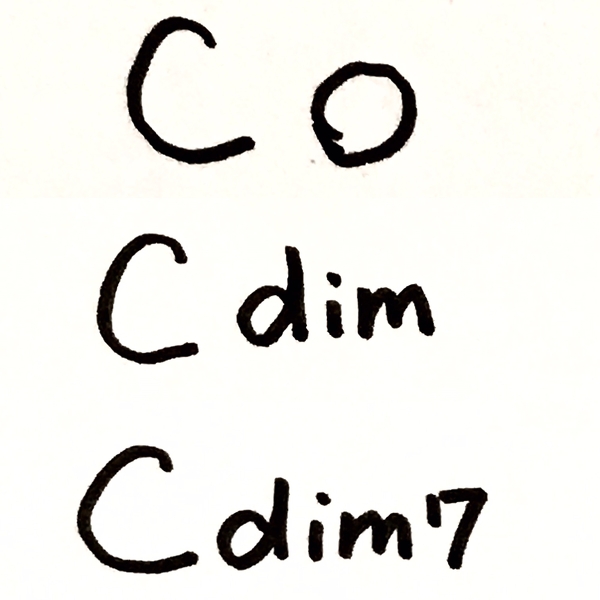 なのでマイナーは「m」で書いてあることがほとんどですし、ディミニッシュも「dim」と書いてます。