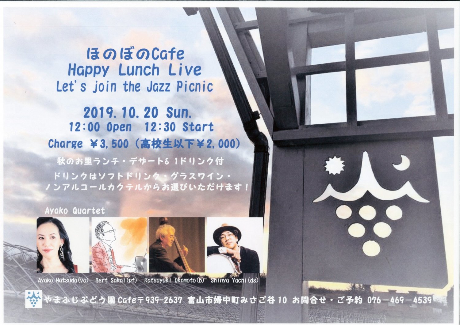 今回はHappy Lunch Live と題して、やまふじぶどう園cafeでピクニック気分で音楽とランチをお楽しみいただきたいと思います。