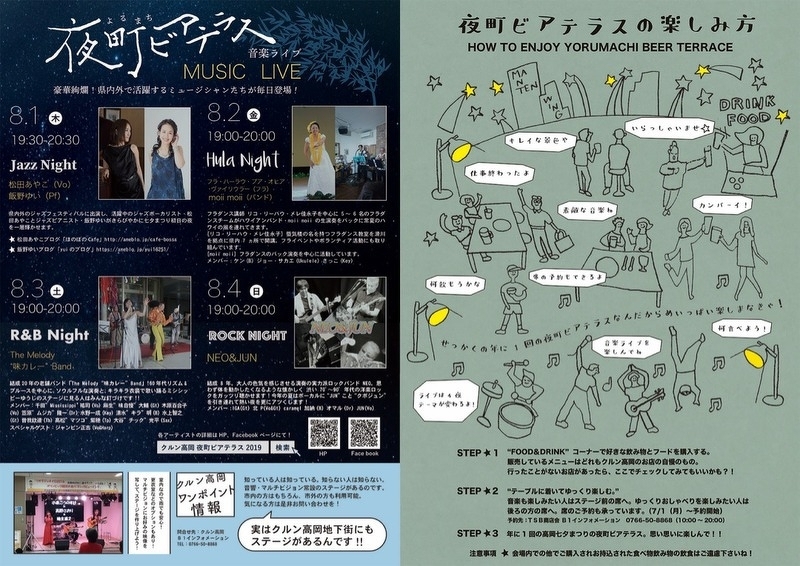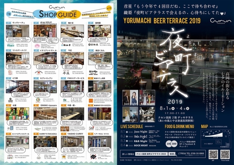 毎年恒例となったクルン高岡2階デッキで開催の「夜町ビアテラス」。今年も開催。駅前のきらめく七夕まつりの景色を見ながら、音楽ライブとクルン高岡のお店の美味しい食べ物とお酒を楽しみま...