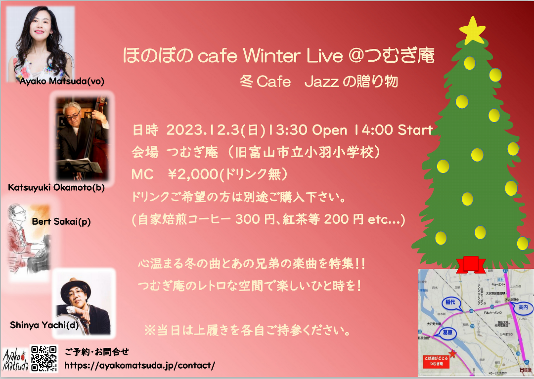ほのぼのcafe Winter Live @つむぎ庵にお越しの皆様へ(駐車場のご案内) 2023.12.01.Fri きらめき✨の12月3日 ほのぼのcafe Winter Liveにお越しの予定の皆様へ この度はご予約をありがとうございます😊 当日の会場の場所と駐車場のご案内です! ご確認をお願いします。 写真にある駐車場ですが、✖️のところは車をとめられません。 なお、感染対策等のため上履きのご用意をお願いします。 当日はお気をつけてお越しください。 場所 つむぎ庵 富山市小羽279(旧小羽小学校内) お飲み物メニューはこちら